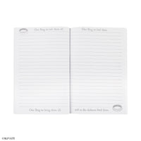 Inside you will find the lined pages with the phrase "One Ring to rule them all, One Ring to find them, One Ring to bring them all and in the darkness bind them." on the top and bottom pages. Carry this notebook to keep your writings, ideas and notes safe.