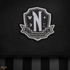 The iconic Nevermore Academy school logo takes centre place, but instead of the classic purple and yellow design, this logo is black and grey. Meanwhile, the bottom half of the backpack is adorned with black and grey stripes.