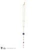 The necklace features a dainty gold chain necklace adorned with blue rhinestones, leading to a faithful replica pendant of the iconic Chocolate Frog box. Below, a singular gold chain gracefully extends, creating a captivating effect with delicate blue flowers and a small chocolate frog character.