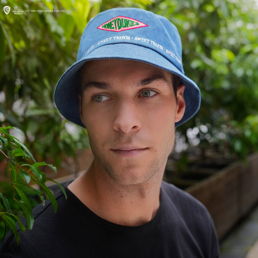 This Honeydukes inspired bucket hat, is a must-have for any Harry Potter fans who wish to bring a little magic to their outfits. The design gives a spotlight to the iconic Honeydukes logo and "Sweet Treats" have been delicately embroidered on the denim hat.