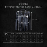 This black blazer features the iconic Nevermore Academy logo, elegantly positioned on the left breast, while the entirety of the garment showcases a mesmerizing pattern of black and grey stripes, faithfully recreating the signature blazers worn by Wednesday Addams in the show.